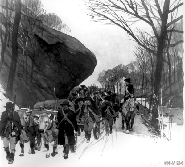On December 19, 1777, at 10 a.m., George Washington and his Continental Army marched out of Rebel Hill and Gulph Mills, past the Hanging Rock, and on to Valley Forge. As one historian wrote, “These grounds were the threshold to Valley Forge, and the story of that winter–a story of endurance, forbearance, and patriotism which will never grow old–had its beginnings here, at the six days encampment by the old Gulph Mill.” (see “The Gulph Hills in the Annals of the Revolution”, by Samuel Gordon Smyth, of West Conshohocken, in an address before the Montgomery County Historical Society, at Ashbourne, Pa., October 6, 1900; address included in Historical Sketches of Montgomery County, Volume 3, Montgomery County Historical Society (1905)).